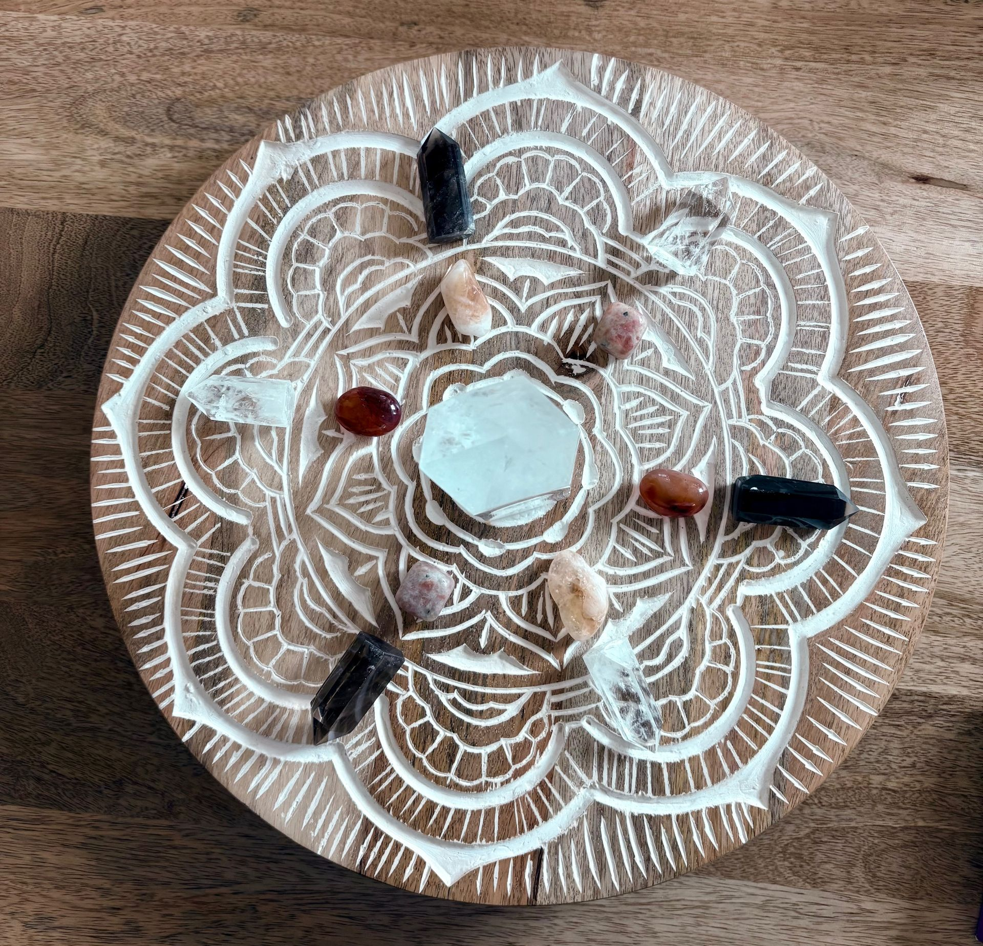 Outer ring: Smoky Quartz & additional Clear Quartz points — providing grounding and safe energetic boundaries as we expand.
