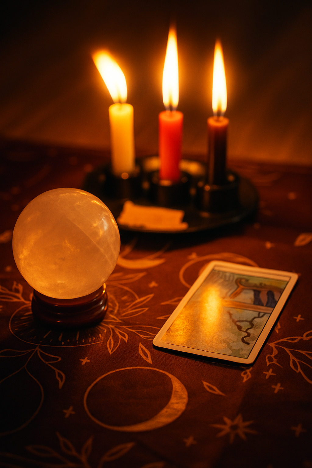 I head to my kitchen altar, which is just a small setup with an altar cloth, three candles on an altar plate, my crystal ball, and the tarot deck I’m working with at the moment. I light the candles, and sometimes I’ll light a stick of incense too—just enough to add a little atmosphere.